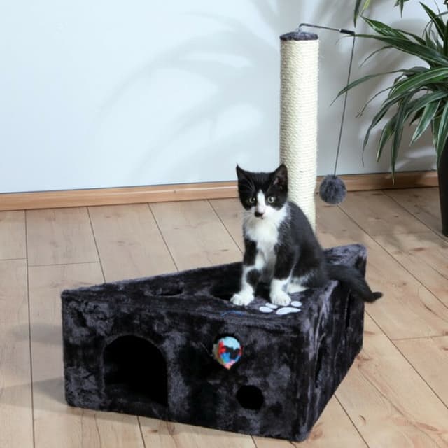 Cet arbre à chat Murcia gris est composé d'un socle cachette en forme de triangle recouvert de peluche.