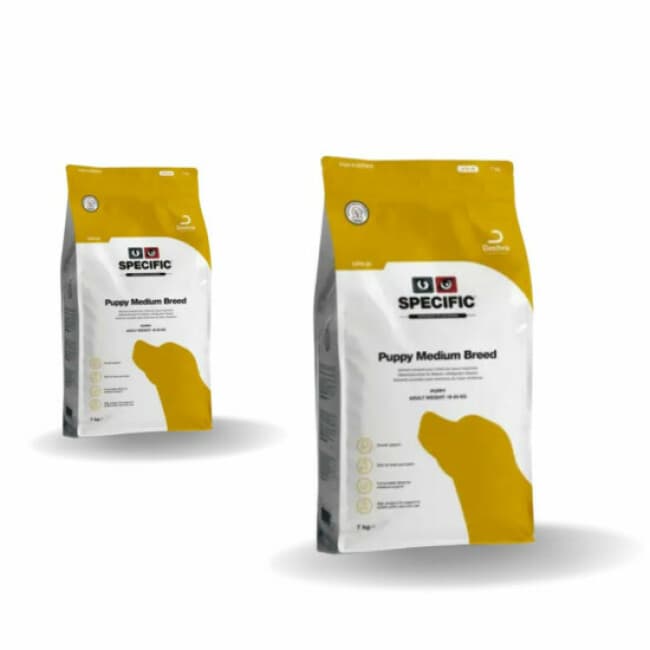 Les croquettes Specific pour chiots CPD Puppy Medium Breed sont disponibles en sac de 4 kg, 7 kg et 12 kg.