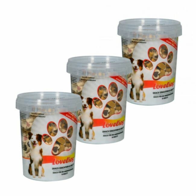 Avec les Friandises pour chien Bubimex Lovelies seau de 300 g, en forme de cœur et aux tendres saveurs de poulet, agneau et saumon vous allez faire un heureux !