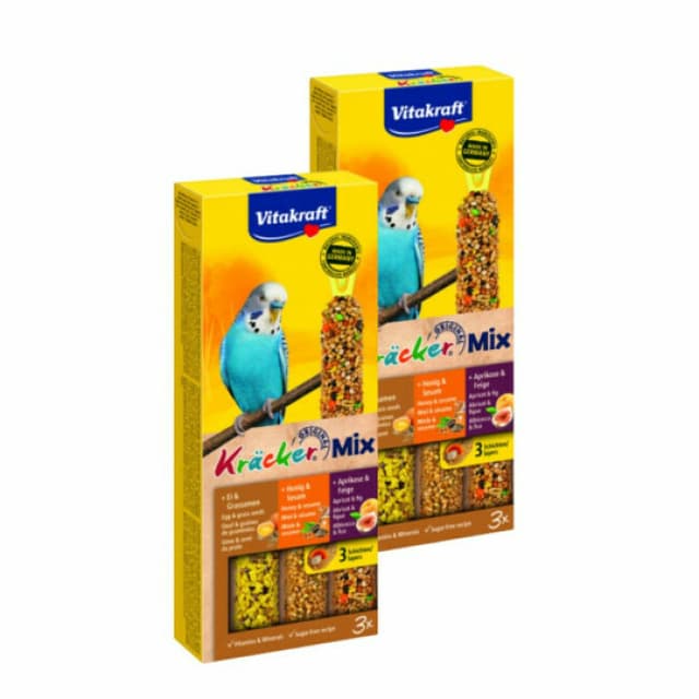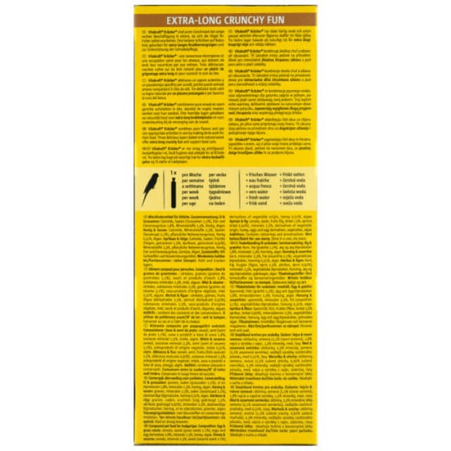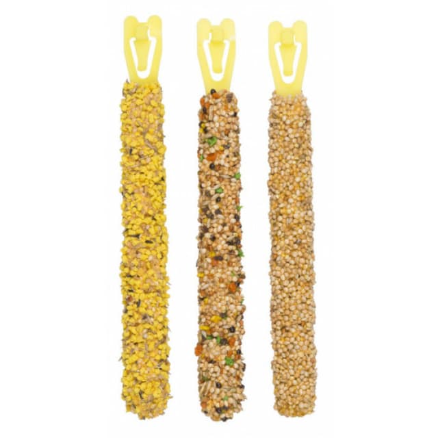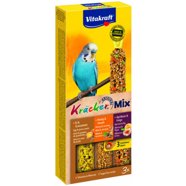 Vitakraft a souhaité varier le plaisir de vos oiseaux et propose trois bâtonnets recouverts chacun d'un mélange énergétique différent, au miel, aux fruits et aux oeufs.