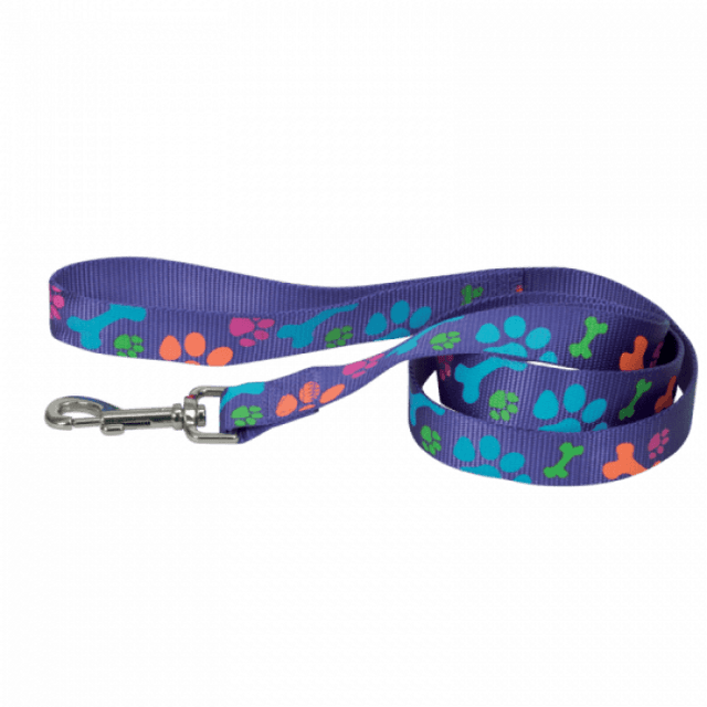 La laisse violette en nylon pour chien motifs pattes Chapuis Sellerie fait partie d'une collection de laisses proposée en plusieurs tailles.