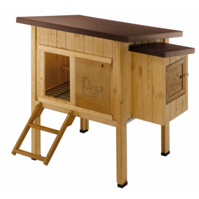 Traitée pour résister à l'extérieur, cette maisonnette est suffisamment spacieuse pour accueillir jusqu'à quatre poules.