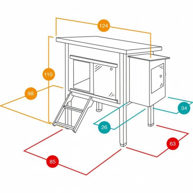 Dimensions sans l'avancée de toit et nichoir : L 85 x l 63 x H 110 cm