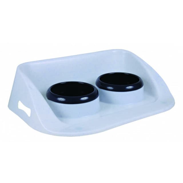 Ce set en plastique comprend deux écuelles sur un support avec rebords pour éviter les éclaboussures.