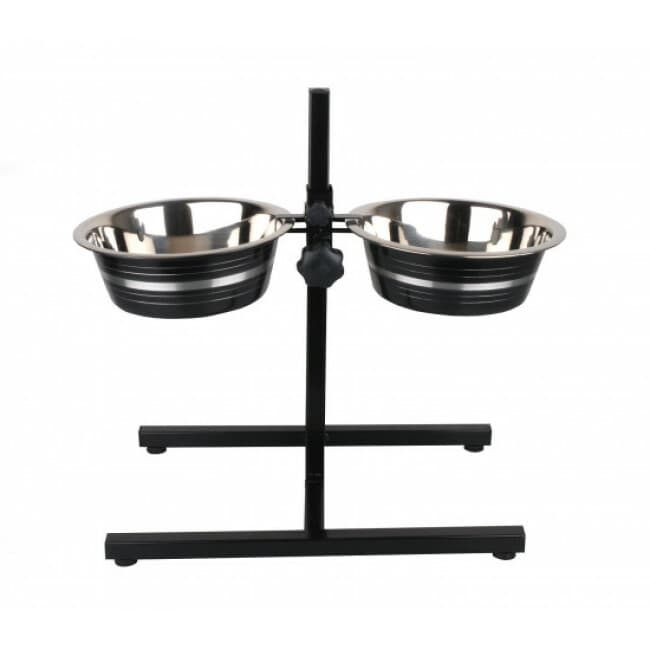 Le support Stripy noir pour double gamelle en inox est réglable. En effet, une molette permet d'adapter la hauteur des gamelles à la taille de votre compagnon jusqu'à 40 cm du sol.